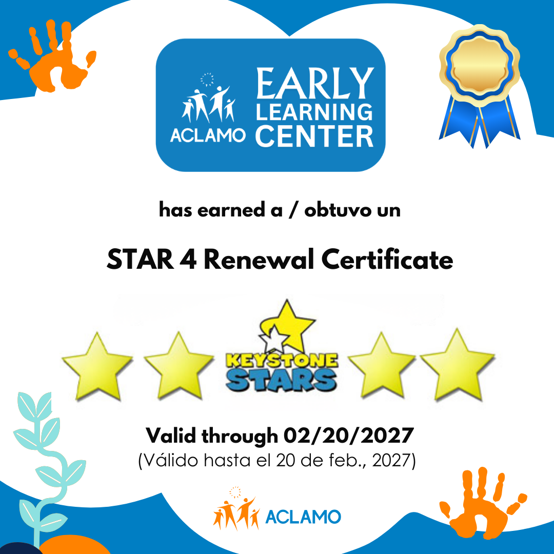We are proud to share several important milestones that reflect the dedication of our team and the strength of our programs. Our center has successfully renewed its Keystone 4-STAR certification through February 2027, the highest recognition of quality in early childhood education.