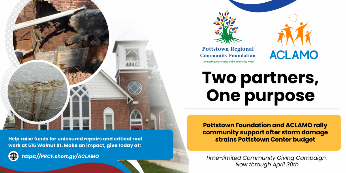 The Pottstown Regional Community Foundation (PRCF) is announcing a partnership with ACLAMO to raise community support for emergency repairs at ACLAMO’s Pottstown Center, 515 Walnut St., after severe water damage last spring led to major unbudgeted expenses. Through a time-limited community giving campaign hosted by PRCF, donations made through April 30, 2026, will be collected and disbursed to support ACLAMO’s weather-related building repair needs, including remaining roof work that leaders say is now the biggest priority.
